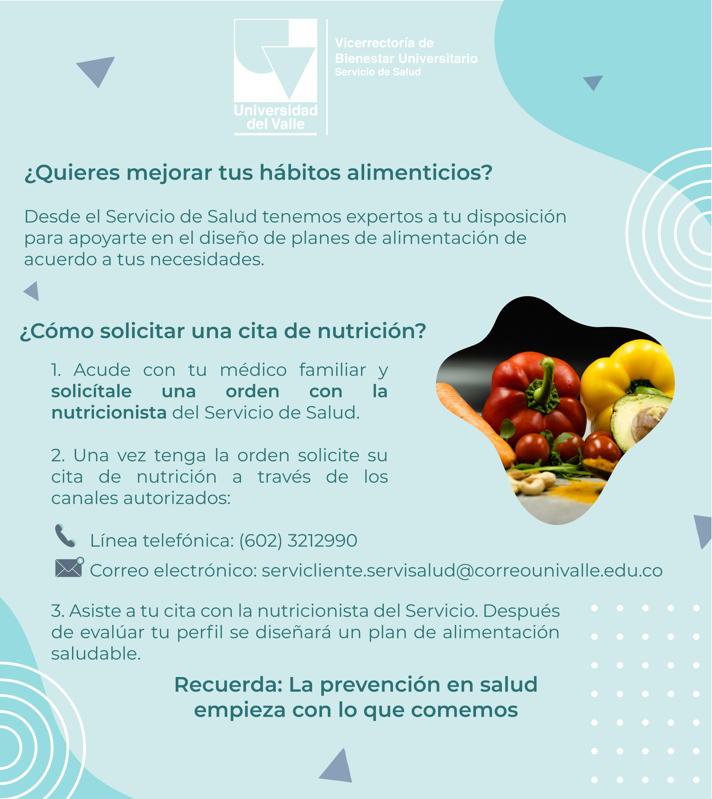 Una alimentación sana y balanceada es la clave de la prevención de cualquier tipo de enfermedad. En el Servicio de Salud estamos comprometidos con el bienestar de nuestros afiliados, es por eso que te invitamos a pedir tu cita de nutrición para ayudarte a diseñar un plan de alimentación sano, saludable, y que responda a tus necesidades.