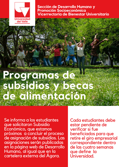 La Sección de Desarrollo Humano y Promoción Socioeconómica informa a los estudiantes que solicitaron Subsidio de alimentación y Becas socioeconómicas, que el proceso de selección está próximo a finalizar. Las asignaciones serán publicadas en la página WEB de la Sección https://bit.ly/2sII8Pp y en la cartelera del edificio Ágora. Cada estudiante debe verificar si fue beneficiado para que retire el giro empresarial en las cuatro semanas que estipula la Universidad.