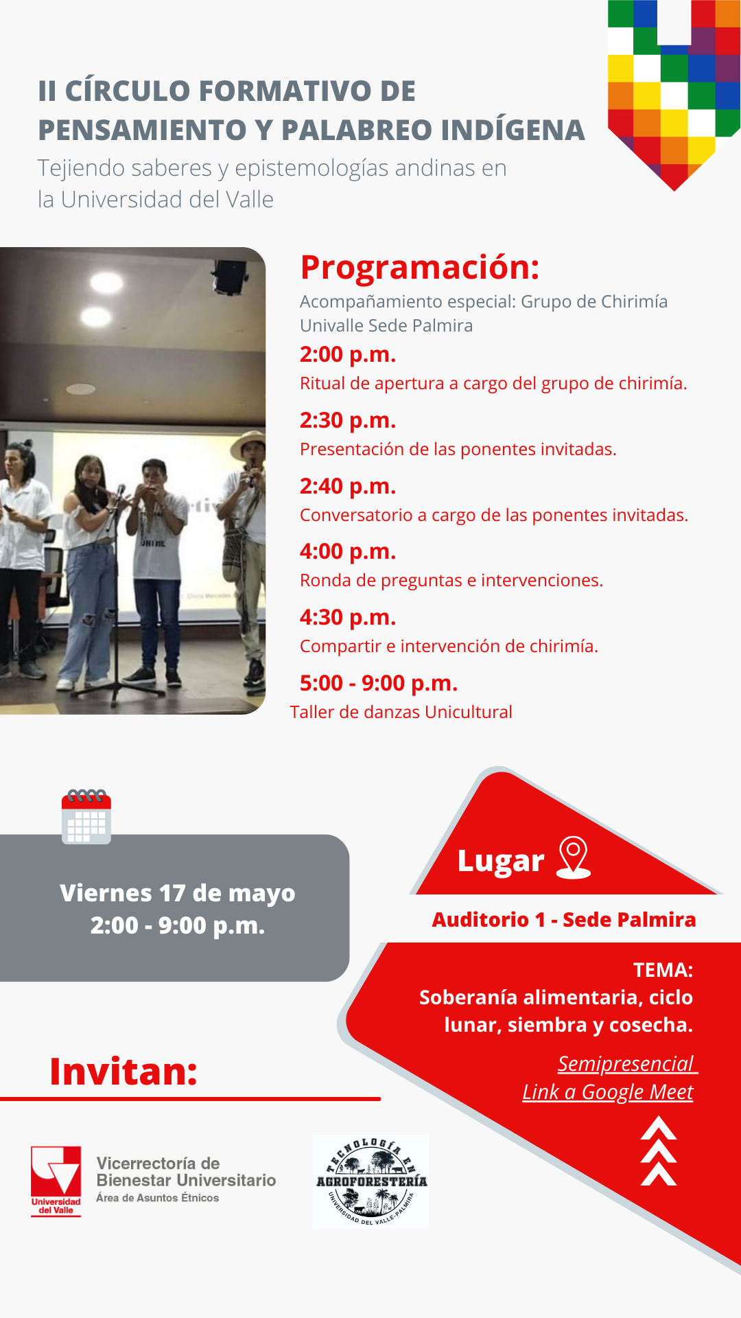 Este año estamos invitando a la comunidad universitaria a participar del “II Circulo formativo de pensamiento y palabreo indígenas” que tendrá diferentes temáticas con cinco momentos, y que busca llegar a las sedes Meléndez y San Fernando en Cali, y a las sedes regionales Palmira y Norte del Cauca. Cada círculo de palabreo contara con la participación de mayores/as, sabias/os líderes/lideresas de los pueblos indígenas, docentes de universidades indígenas y universidades públicas y privadas convencionales a nivel nacional e internacional.