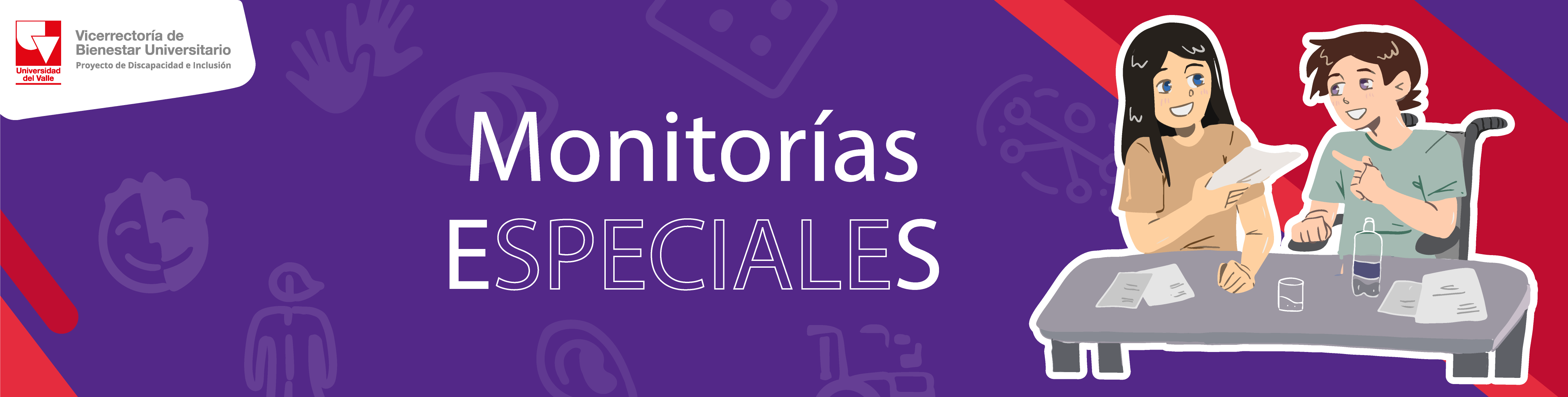 Las Monitorias Especiales son aquellas que se otorgan a estudiantes con discapacidad de pregrado para la óptima participación en la vida universitaria mediante el acompañamiento de un(a) estudiante regular a el/la cual se le denomina Monitor(a) Especial.