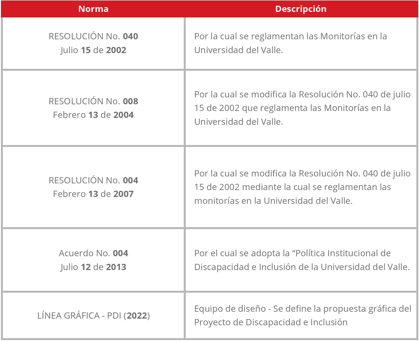 Segunda Norma. Resolución número 008 del Febrero trece del año 2004. Por la cual se modifica la Resolución número 040 de julio quince de 2002 que reglamenta las Monitorías en la Universidad del Valle.